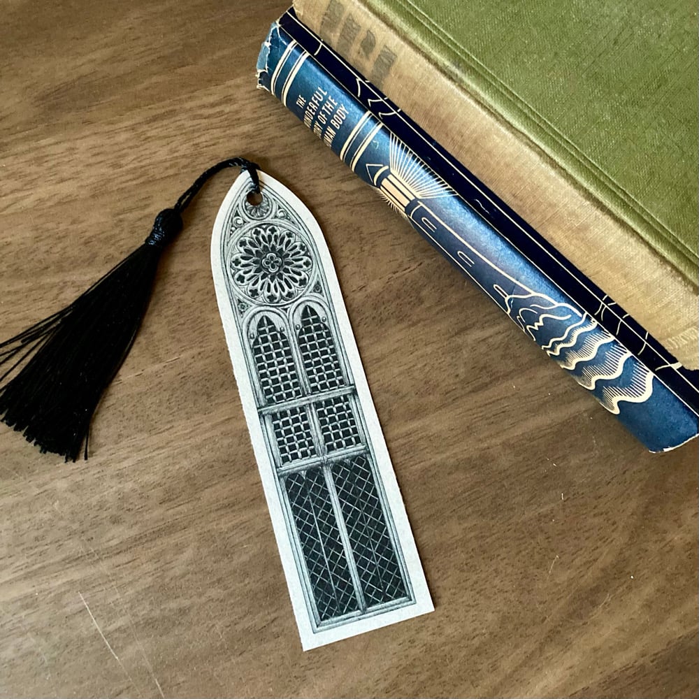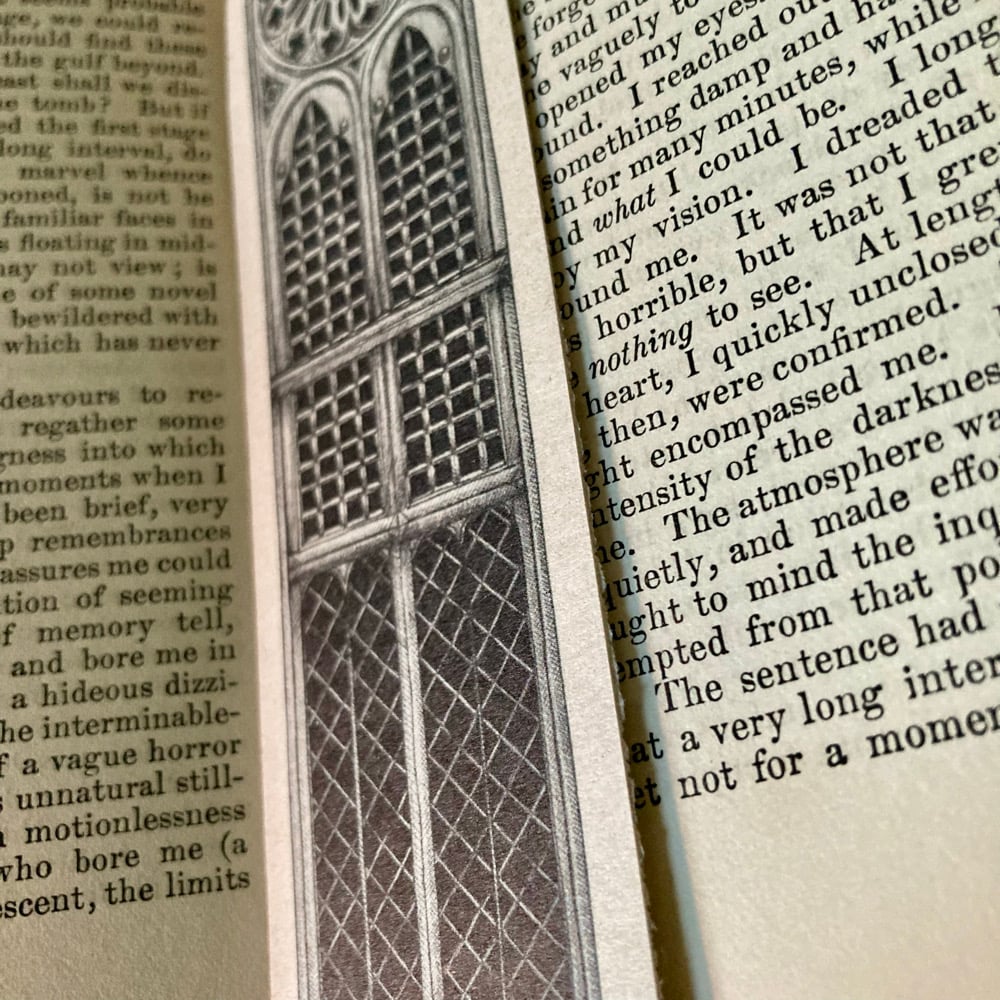 The perfect companion for all your gothic tales. The Cathedral Bookmark is printed with an elongated gothic church window. Hand drawn and printed in the UK. Each one is cut to shape by hand, so slight variations are to be expected. Printed on Oribi Straw - paper made from agricultural waste and packaged in a glassine envelope.